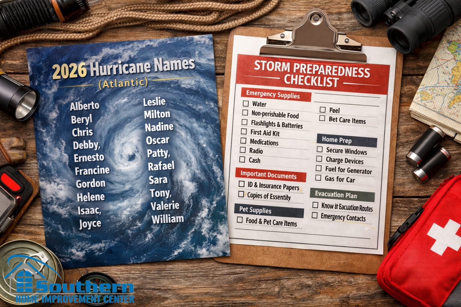 Hurricane prep is easier when the essentials are in one place. This guide gives you the official 2026 Atlantic hurricane names, the season dates homeowners should keep in mind, a printable storm-name tracker, and a simple Gulf Coast decision ladder for Southeast Louisiana and the Mississippi Gulf Coast.