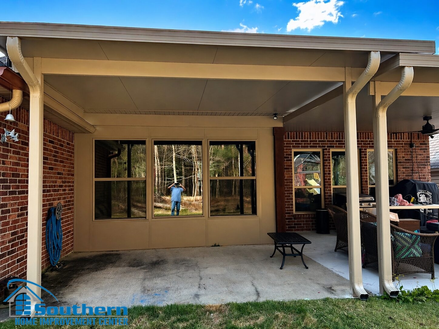 Southern Home Improvement Center (SHIC) completed a phased backyard upgrade in Madisonville, Louisiana, combining a Thermal Three glass room enclosure, a concrete slab, and matching insulated patio covers in a coordinated Clay finish.