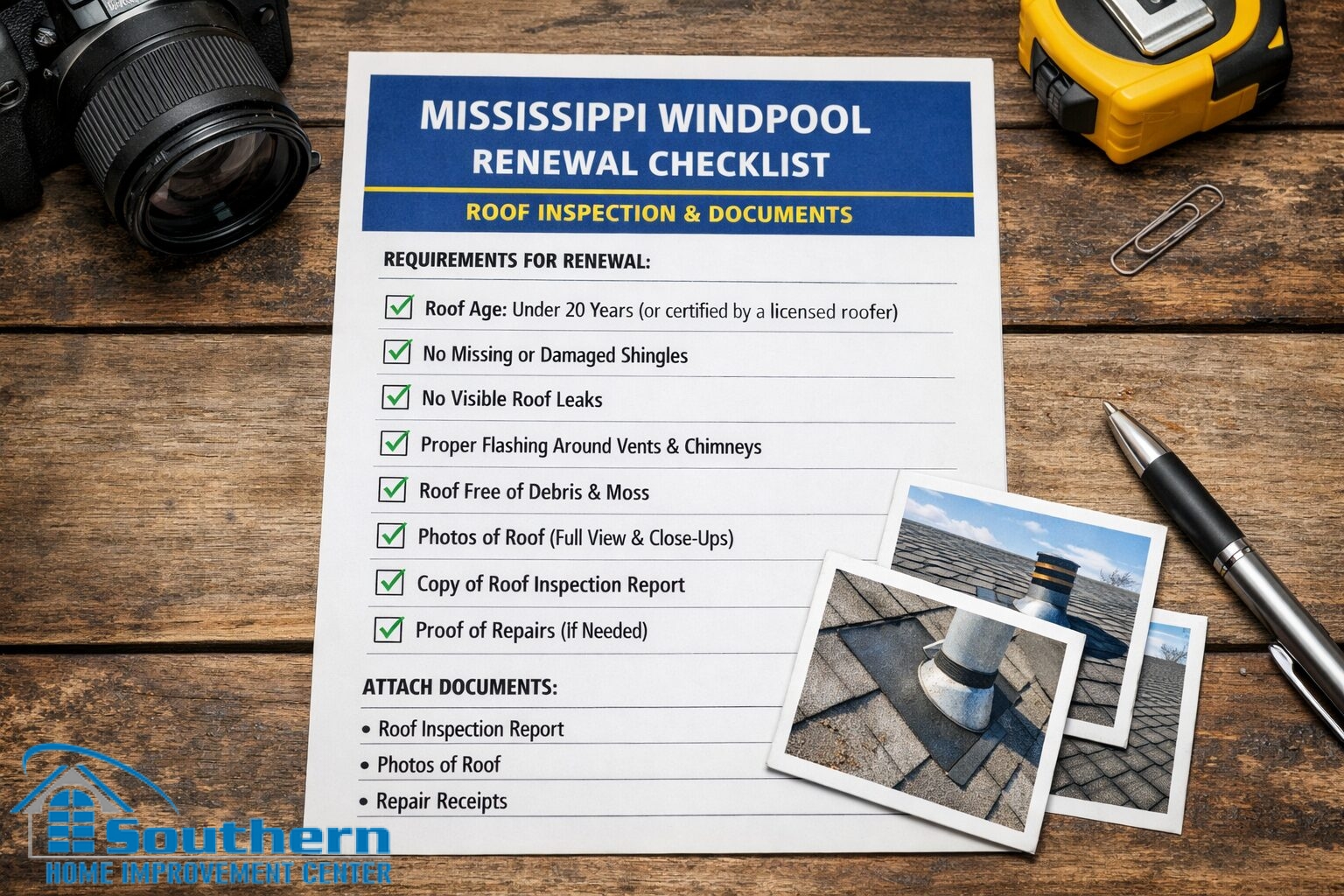 If you need a documented roof condition report or a reroof plan that supports mitigation documentation, Southern Home Improvement Center (SHIC) serves the Mississippi Gulf Coast. Call (228) 467-7484 to schedule an on-site visit and get a clear scope for repair vs. replacement.