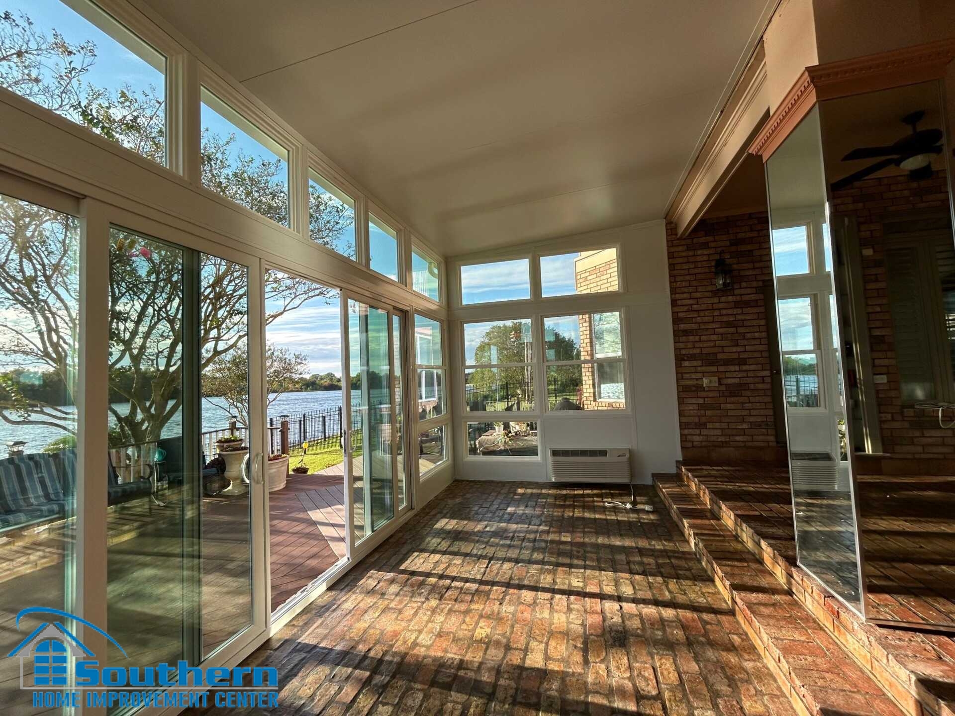 For a lakefront property in New Orleans, our team completed a custom Southern Sun Room—another successful sunroom installation in New Orleans. We removed an outdated glass enclosure and built a climate-ready addition using a Thermal Three insulated glass system (10′ × 22′) with Lifetime vinyl windows, upper/lower transoms, and an Almond finish. The room features Low-E, argon-filled, solar-control glazing on every unit and two heavy-duty 6-ft full-view insulated sliding doors. Above, a 3″ foam-filled insulated roof (11′ × 24′) with integrated gutters and two fan beams keeps the space cool and quiet. Two hotel-style PTAC units provide independent, efficient climate control.