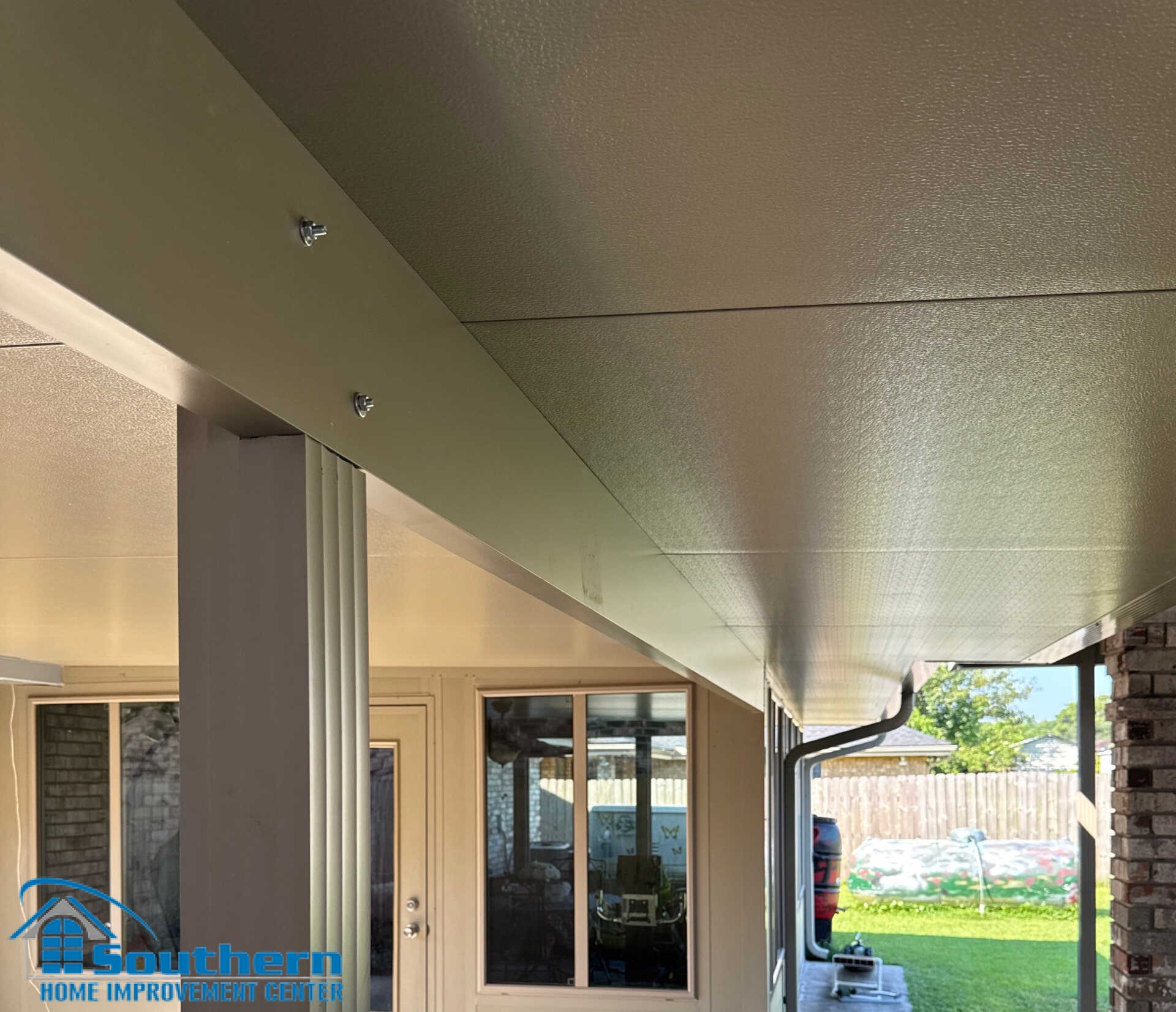 We corrected transitions at the glass-to-patio junction, stiffened long spans, and restored a smooth interior ceiling. The storm-damaged 14′ × 20′ glass room was re-roofed with 3″ insulated, foam-filled panels, and the same roof plane was extended over the 16′ × 16′ patio cover and the carport to create one continuous system. Two structural box beams keep the long runs straight, while a fan beam provides a clean, code-ready pathway for a future ceiling fan or light. A continuous gutter with large downspouts now directs water away from door thresholds and walkways. For alternatives and design ideas, see our Patio Covers in Southeast Louisiana.